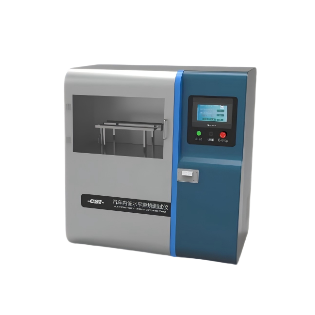 测试仪通过测试燃烧一定距离需要的时间获得材料燃烧时火焰蔓延的趋势及火焰蔓延速度,检测是汽车内装饰织物的相对燃烧速率及阻燃性。